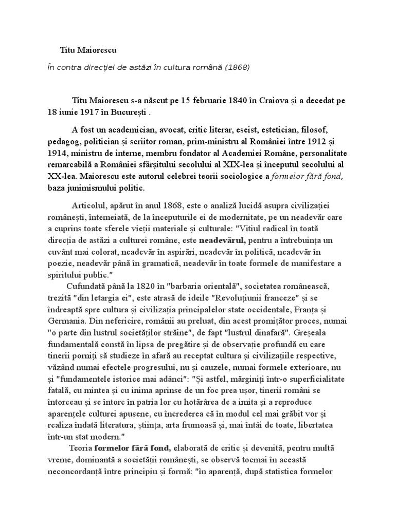Titu Maiorescu In Contra Direcţiei De Astăzi In Cultura Romană 1868