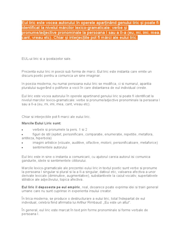 Extrage Din Text 2 Versuri In Care Exista Marci Lexico Gramaticale Diferite Ale Eului Liric Si Brainly Ro