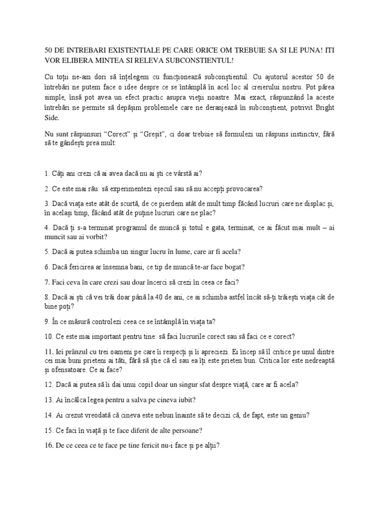 50 De Intrebari Existentiale Pe Care Orice Om Trebuie Sa Si Le Puna Docx