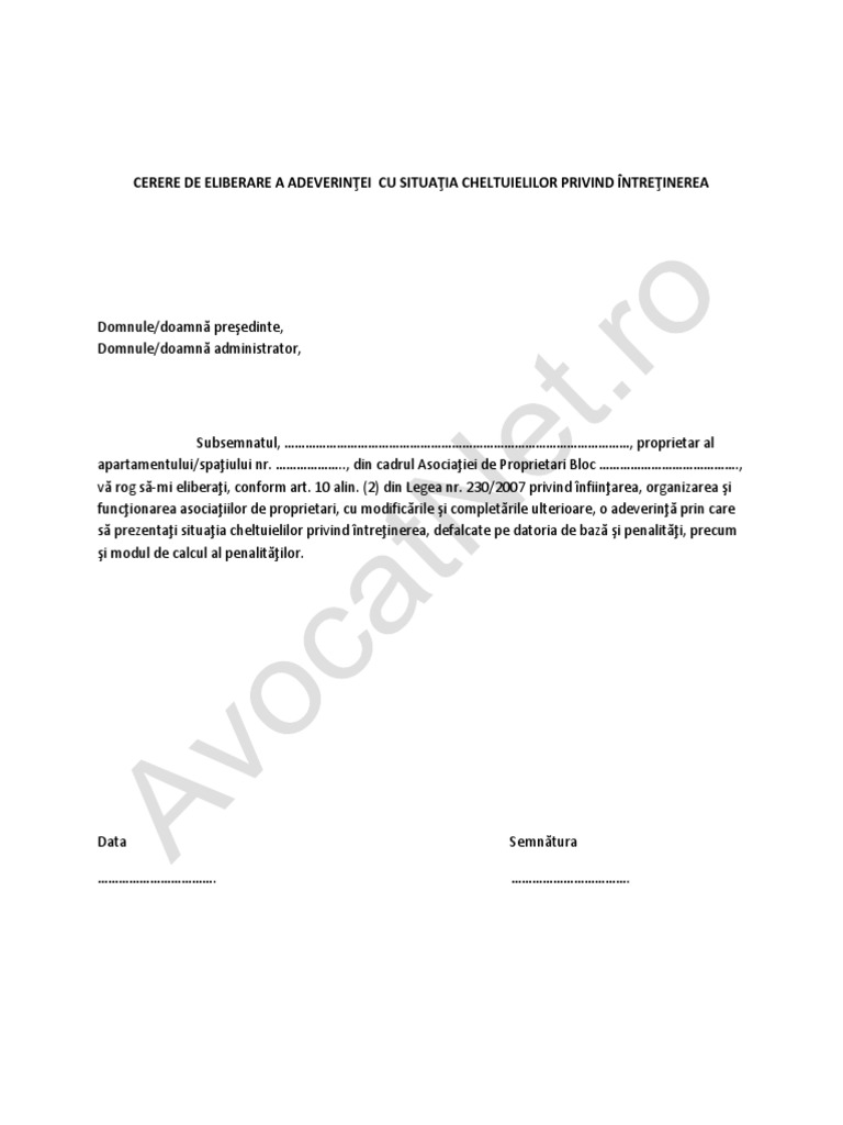 Model De Cerere Pentru Eliberarea Adeverintei Cu Situatia Cheltuielilor De Intretinere Sursa Www Avocatnet Ro Pdf