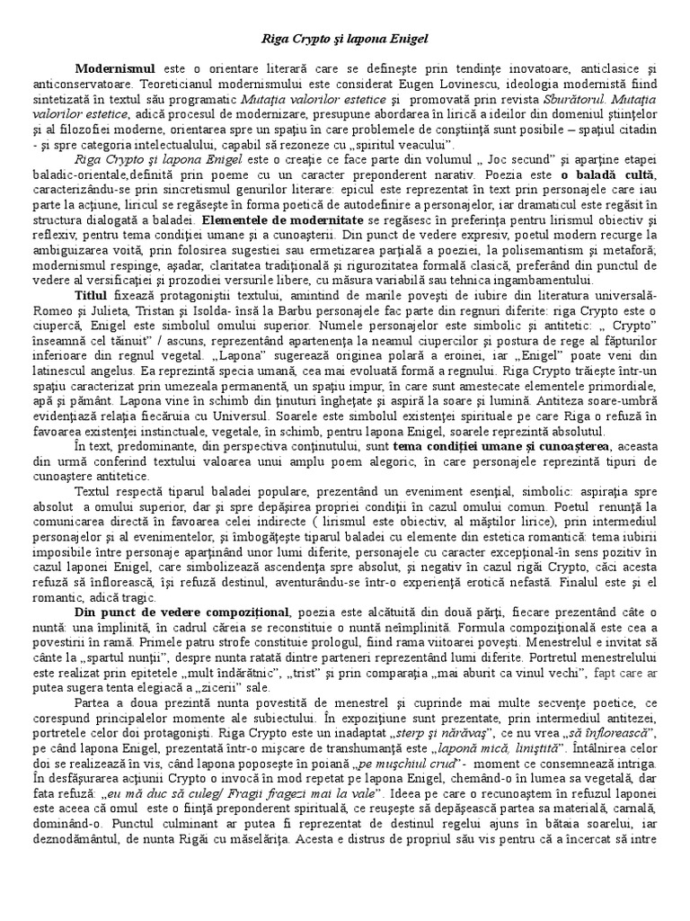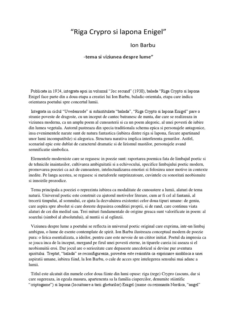 Tema Si Viziunea Despre Lume Text Poetic I Barbu Riga Lapona