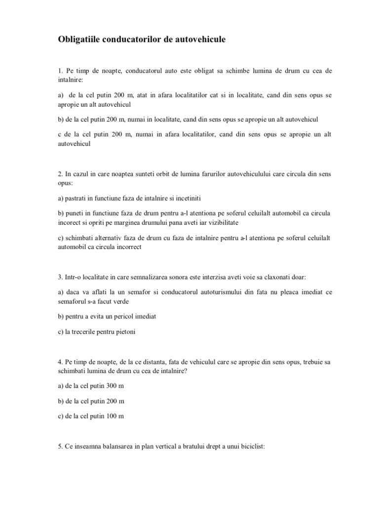 Chestionare Auto In Care Dintre Situaţii Conducătorul De Autovehicule Este Obligat Pe Timp De Noapte Să Schimbe Lumina De Drum Cu Cea De Intalnire